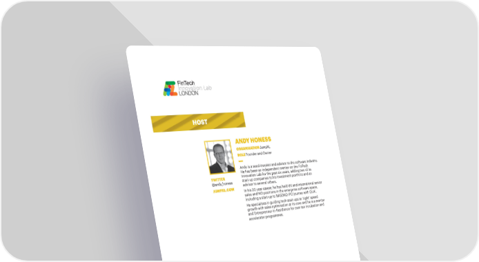 HOST ANDY HONESS ORGANISATION JumpXL ROLE Founder and Owner Andy is a seed investor and advisor to the software industry. He has been an independent mentor on the FinTech TWITTER Innovation Lab for the past six years, adding two of its @andy_honess start-up companies to his investment portfolio and an JUMPXL.COM advisor to several others. In his 30 year career, he has held UK and international senior sales and MD positions in the enterprise software space, including a start-up to NASDAQ IPO journey with QLIK. He specialises in guiding tech start-ups to ‘right’ speed growth with sales optimisation at its core and he is a mentor and Entrepreneur-in-Residence for over ten incubation and accelerator programmes. 4 ACC0718992528-5_FinTech Graduation Day 2019_A5 brochure_V9 SL.indd 4 22/03/2019 08:46