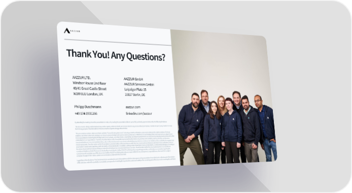 By attending the meeting where this presentation is made, or by reading the presentation slides in part or full, you hereby a gre e to be bound by the following limitations: This document is strictly confidential and may not be copied, published, distributed or transmitted to any person without per mis sion, in whole or in part, by any medium or in any form for any purpose. The information in this document is subject to change without notice. This presentation contains statements that constitute “forward looking statements” including and without limitation, statemen ts relating to the implementation of strategic initiatives and other statements relating to our future business developments and economic performance. While these forward - look ing statements represent our judgment and future expectations concerning the development of our business, a number of risks, uncertainties and other important factors co uld cause actual developments and results to differ materially from our expectations. Therefore, the information on this Presentation is provided for information only and does n ot constitute, and should not be construed as, investment advice or a recommendation to buy, sell, or otherwise transact in any investment including any products or service s o r an invitation, offer or solicitation to engage in any investment activity. The information on this Presentation is provided solely on the basis that you will make your own investm ent decisions and AAZZUR does not take account of any investor’s investment objectives, particular needs, or financial situation. In addition, nothing on this Presentation sha ll, or is intended to, constitute financial, legal, accounting or tax advice. Any investment decision that you make should be based on an assessment of your own risks. The information within thi s document arises from sources that are considered reliable by AAZZUR but are not checked by a neutral party. Neither AAZZUR nor third parties are granting guarantie s, confirmations or warranties regarding the correctness and completeness of this document. Neither AAZZUR nor third parties take any responsibility for any consequences, es pecially losses, that result from usage or omission of usage of information, opinions or conclusions contained in this document. Legal effect of this disclaimer: This Disclaimer is to be considered as part of descriptions and information given on this pr ese ntation. If any individual or collective part of formulation of this text does not at all, or partially or completely correspond to what is legally required, the content and validity of the remaining parts of the document remain legally unaffected. Thank You! Any Questions? linkedin.com/aazzur aazzur.com AAZZUR LTD. Windsor House 2nd floor 40/41 Great Castle Street W1W 8LU London, UK AAZZUR GmbH AAZZUR Services GmbH Leipziger Platz 15 10117 Berlin, DE Philipp Buschmann +49 174 1931266 10 10