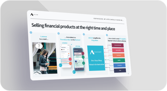 OUR MISSION: MY APPS SHOULD KNOW ME... Selling financial products at the right time and place Accounts & Cards Wealth Loans & BNPL Tools Insurances Currencies One - Stop - Shop Fintech Orchestration ... from a list of curated API - suppliers that don’t deliver to devices directly Customer has a need ... AAZZUR simplifies the integrations 1 4 account wealth wealth loan insurance ... that relates to a financial product on the frontend 2 3 or 2 entire App embedded