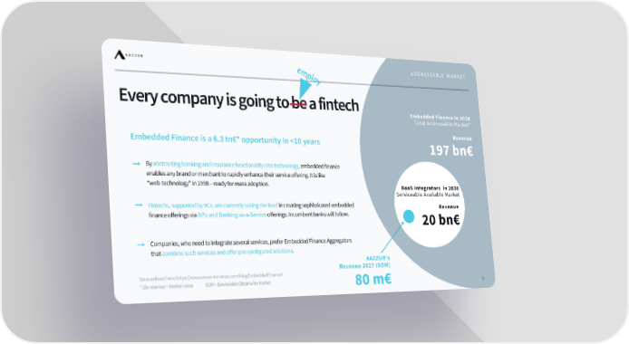 employ Every company is going to be a fintech AAZZUR’s Revenue 2027 (SOM) 80 m € Sources listed here: https:// www.simon - torrance.com /blog/EmbeddedFinance1 * 20x revenue = market value SOM = Serviceable Obtainable Market By abstracting banking and insurance functionality into technology , embedded f inance enables any brand or merchant to rapidly enhance their service offering. It is like “web - technology” in 1998 – ready for mass adoption. Fintechs , supported by VCs, are currently taking the lead in creating sophisticated embedded finance offerings via APIs and Banking - as - a - Service offerings. Incumbent banks will follow. Companies, who need to integrate several services, prefer Embedded Finance Aggregators that combine such services and offer pre - configured solutions . Embedded Finance in 2030 Total Addressable Market* BaaS Integrators in 2030 Serviceable Available Market Revenue 197 bn € Revenue 20 bn € Embedded Finance is a 6.3 tn € * opportunity in <10 years ADDRESSABLE MARKET 6