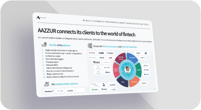 Our open API platform bundles and integrates banks, wealth and fintechs . 100% built in - house. Microservices with plug - ins to providers. Implementation support available. 5 Access the fintech ecosystem with ONE INTEGRATION AAZZUR connects its clients to the world of fintech Benefits of the platform KYC 1. Single security environment / single sign on 2. Product abstraction layer / vendor independence 3. Unified data model 4. Event and data triggers 5. Charging engine 6. Interoperability 7. Solves international scaling issues 8. Open to connect to internal systems 9. Single customer view 10. Backend functionality for customer service Our implementation partners Currencies Accounts & Cards Loans & BNPL Insurances Tools Wealth IOS Android Web Frontend Dev. Portal Middleware WE BUILT A NUMBER OF PARTNERSHIPS, SMART FINANCE BLOCKS AND TOOLS Customer ... core banking SME lendering Retail lendering KYC CO2