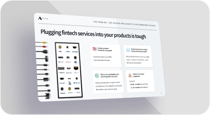 Plugging fintech services into your products is tough 3 THE PROBLEM - FOR ANYONE WHO WANTS TO USE EMBEDDED FINANCE A Fintech Tech Stack is expensive APIs are not standardized and need integration every time Orchestration layer is mission critical and not easy to build Interfaces needed Frontends not supplied Customers don’t touch APIs - customers touch devices Typically - € 500k - € 5million investment - 12 - 24+ months development Nearly all propositions require similar combination and integrations of several API - vendors over and over again Why build connections, security, single sign - on, abstraction, GDPR etc. when this can be productised? *every fintech supplier is different