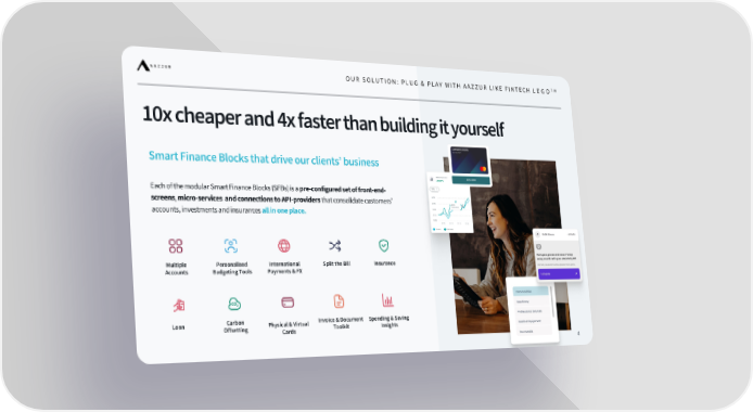 Each of the modular Smart Finance Blocks (SFBs) is a pre - configured set of front - end - screens , micro - services and connections to API - providers that consolidate customers’ accounts, investments and insurances all in one place. OUR SOLUTION: PLUG & PLAY WITH AAZZUR LIKE FINTECH LEGO TM 10x cheaper and 4x faster than building it yourself Multiple Accounts Carbon Offsetting Personalised Budgeting Tools Insurance Physical & Virtual Cards Split the Bill International Payments & FX Loan Invoice & Document Toolkit Spending & Saving Insights Smart Finance Blocks that drive our clients’ business 4