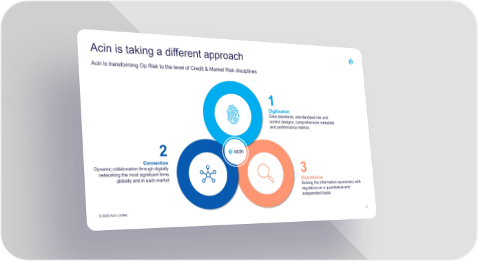 Acin is taking a different approach Acin is transforming Op Risk to the level of Credit & Market Risk disciplines 1 Digitisation Data standards, standardised risk and control designs, comprehensive metadata and performance metrics 2 Connection Dynamic collaboration through digitally 3 networking the most significant firms globally and in each market Quantitative Solving the information asymmetry with regulators on a quantitative and independent basis © 2023 Acin Limited 4