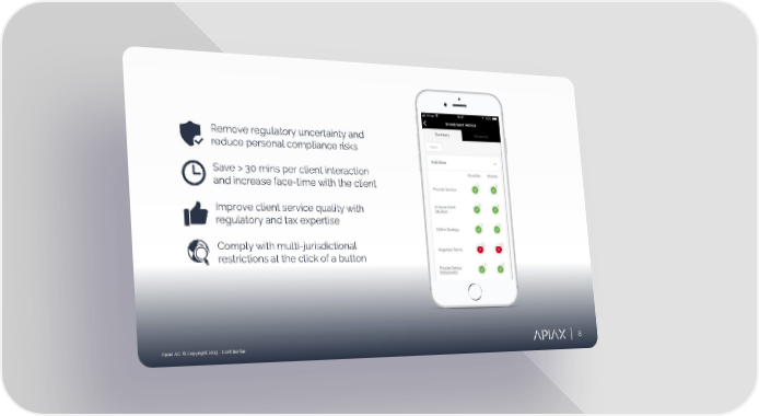 Remove regulatory uncertainty and reduce personal compliance risks Save > 30 mins per client interaction and increase face-time with the client Improve client service quality with regulatory and tax expertise Comply with multi-jurisdictional restrictions at the click of a button Apiax AG © Copyright 2019 -Confidential 8