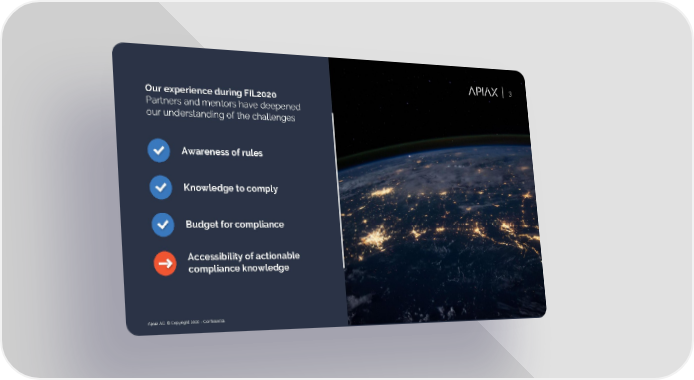 3 Our experience during FIL2020 Partners and mentors have deepened our understanding of the challenges Awareness of rules Knowledge to comply Budget for compliance Accessibility of actionable compliance knowledge Apiax AG © Copyright 2020 -Confidential