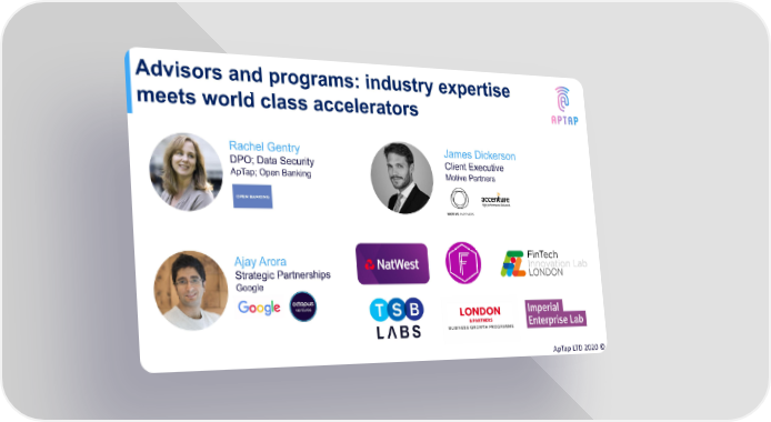 Advisors and programs: industry expertise meets world class accelerators Rachel Gentry James Dickerson DPO; Data Security Client Executive ApTap; Open Banking Motive Partners Ajay Arora Strategic Partnerships Google ApTap LTD 2020 ©