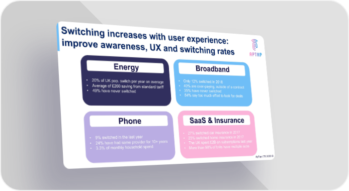 Switching increases with user experience: improve awareness, UX and switching rates Broadband Energy Broadband • 20% of UK pop. switch per year on average • Only 12% switched in 2018 • Average of £260 saving from standard tariff • 40% are over-paying, outside of a contract • 49% have never switched • 35% have never switched • 54% say too much effort to look for deals Phone SaaS & Insurance • 9% switched in the last year • 27% switched car insurance in 2017 • 24% have had same provider for 10+ years • 23% switched home insurance in 2017 • 3.3% of monthly household spend • The UK spent £2B on subscriptions last year • More than 90% of brits have multiple subs ApTap LTD 2020 ©