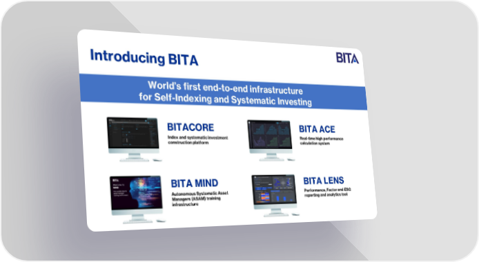 Introducing BITA World’s first end-to-end infrastructure for Self-Indexing and Systematic Investing BITACORE BITA ACE Index and systematic investment Real-time high performance construction platform calculation system BITA MIND BITA LENS BITACORE Performance, Factor and ESG Autonomous Systematic Asset Managers (ASAM) training reporting and analytics tool infrastructure