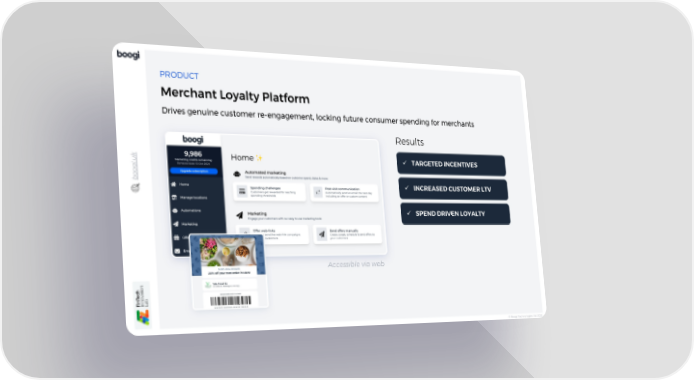 © Boogi Technologies Ltd 2023 boogi.uk Drives genuine customer re - engagement, locking future consumer spending for merchants ü TARGETED INCENTIVES ü INCREASED CUSTOMER LTV ü SPEND DRIVEN LOYALTY Results PRODUCT Merchant Loyalty Platform Accessible via web