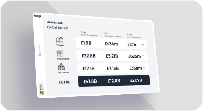 © Boogi Technologies Ltd 2023 boogi.uk MARKET SIZE Global Market SOM (Potential penetration) SAM (Open Banking Countries) £1.9B TAM (Towns >10k population) £434m Merchants Towns Consumer £87m £22.8B £5.21B £625m £17.1B £7.16B £358m £41.8B £12.8B £1.07B TOTAL 20% 12% 5%