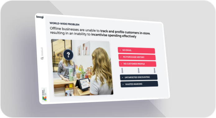 © Boogi Technologies Ltd 2023 boogi.uk WORLD - WIDE PROBLEM Offline businesses are unable to track and profile customers in - store , resulting in an inability to incentivise spending effectively ? Ø NO EMAIL Ø NO PURCHASE HISTORY Ø NO CUSTOMER PROFILE Ø UNTARGETED DISCOUNTING Ø WASTED MARGINS