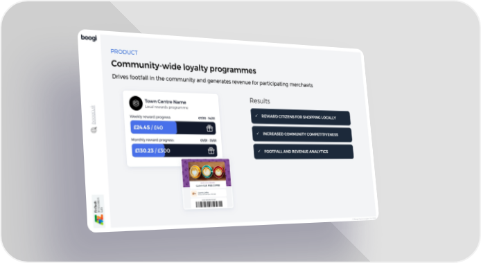 © Boogi Technologies Ltd 2023 boogi.uk PRODUCT Community - wide loyalty programmes Drives footfall in the community and generates revenue for participating merchants ü REWARD CITIZENS FOR SHOPPING LOCALLY ü INCREASED COMMUNITY COMPETITIVENESS ü FOOTFALL AND REVENUE ANALYTICS Results