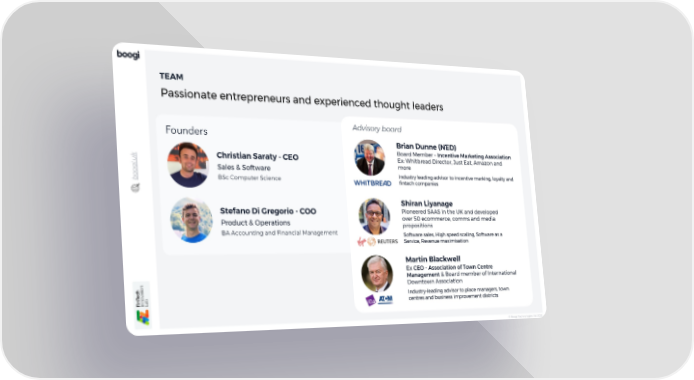 © Boogi Technologies Ltd 2023 boogi.uk Founders Christian Saraty - CEO Advisory board Martin Blackwell Ex CEO - Association of Town Centre Management & Board member of International Downtown Association Industry - leading advisor to place managers, town centres and business improvement districts Brian Dunne (NED) Board Member – Incentive Marketing Association Ex: Whitbread Director, Just Eat, Amazon and more Industry leading advisor to incentive marking, loyalty and fintech companies Shiran Liyanage Pioneered SAAS in the UK and developed over 50 ecommerce, comms and media propositions Software sales, High speed scaling, Software as a Service, Revenue maximisation TEAM Passionate entrepreneurs and experienced thought leaders Sales & Software BSc Computer Science Stefano Di Gregorio - COO Product & Operations BA Accounting and Financial Management