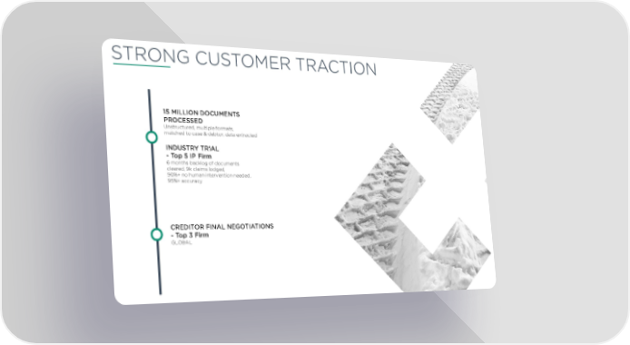 STRONG CUSTOMER TRACTION 15 MILLION DOCUMENTS PROCESSED Unstructured, multiple formats, matched to case & debtor, data extracted INDUSTRY TRIAL - Top 5 IP Firm 6 months backlog of documents cleared, 9k claims lodged, 90%+ no human intervention needed, 95%+ accuracy CREDITOR FINAL NEGOTIATIONS - Top 3 Firm GLOBAL