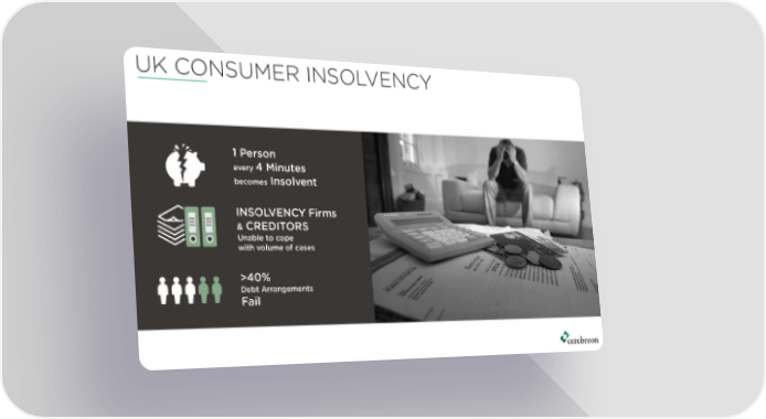Cerebreon - Pitch Deck Page 3 Page 5UK CONSUMER INSOLVENCY 1 Person every 4 Minutes becomes Insolvent INSOLVENCY Firms & CREDITORS Unable to cope with volume of cases >40% Debt Arrangements Fail