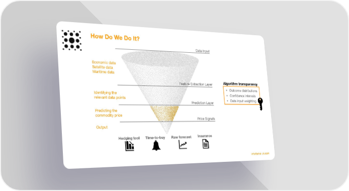How Do We Do It? Data Input Economic data Satellite data Maritime data Algorithm transparency Feature Extraction Layer • Outcome distributions Identifying the • Confidence intervals relevant data points • Data input weighting Prediction Layer Predicting the commodity price Price Signals Output Insurance Hedging tool Time-to-buy Raw forecast Info@chai-uk.com