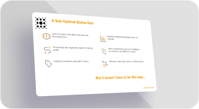 A Sub-Optimal Status Quo Lack of access to the latest data sets and Standard datasets are already priced into information flow. markets. Price swings can negatively impact on trading More sophisticated sources of intelligence profits. are expensive and difficult to obtain. Hedging is expensive and admin. heavy. Alternative data often comes in different forms. But it doesn’t have to be this way... [email protected]