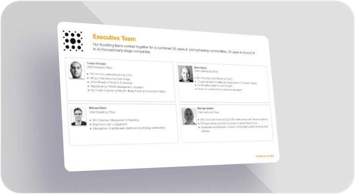 Executive Team Our founding team worked together for a combined 50 years in pricing/trading commodities, 20 years in AI and 10 in AI-focused early stage companies. Tristan Fletcher Steve Butler Chief Executive Officer Chief Commercial Officer ● PhD on AI in commodity pricing (UCL). ● BA in Business and Marketing (Dublin) ● MEng in Manufacturing (Cambridge). ● 12 years as head of trading at a large global CTA (Aspect Capital). ● Junior Research Fellow in AI (Imperial). ● Commodities trader for over 20 years. ● Manufacturing / FMCG management consultant. ● Advisor to commodity-focused asset managers. ● Algo trader in global commodity Hedge Funds and Investment Banks. Marcus Dixon Michael Button Chief Operating Officer Chief Technical Officer ● BA in Business Management & Marketing. ● MSc Computer Science (UCL) & BSc Mathematics with Statistics (Bristol). ● Board-level client engagement. ● Principal software architect & engineer in global Hedge Funds. ● Management of global sales pipeline and technology partnerships. ● Development/architecture of mission-critical trading and financial services software. [email protected]