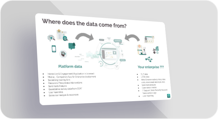 Where does the data come from? Platform data Your enterprise ??? ● Interaction & Engagement (Application in browser) ● DLP data ● Mobile - Companion App for Enterprise deployment ● UEBA data ● Social Engineering Sim ● Web/Browser activity (risky sites ● Password/Passphrase interventions visits, downloads attempts, etc), ● Sentiment Analysis ● Sentiment analysis ● Quantitative survey data from CCAT ● Clear desks checks ● User heuristics ● IT Support Desk/Security Support ● Behaviour nudges & responses Team contact logs ● User reporting