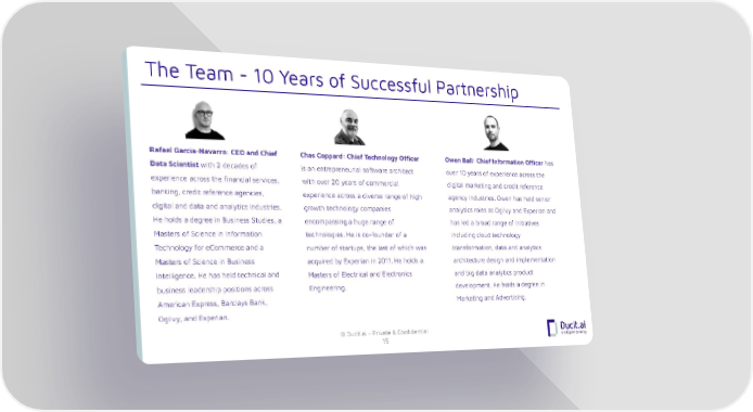 The Team - 10 Years of Successful Partnership Rafael Garcia-Navarro: CEO and Chief Chas Coppard: Chief Technology Officer Owen Ball: Chief Information Officer has Data Scientist with 2 decades of is an entrepreneurial software architect over 10 years of experience across the experience across the financial services, with over 20 years of commercial digital marketing and credit reference banking, credit reference agencies, experience across a diverse range of high agency industries. Owen has held senior digital and data and analytics industries. growth technology companies analytics roles at Ogilvy and Experian and He holds a degree in Business Studies, a encompassing a huge range of has led a broad range of initiatives Masters of Science in Information technologies. He is co-founder of a including cloud technology Technology for eCommerce and a number of startups, the last of which was transformation, data and analytics Masters of Science in Business acquired by Experian in 2011. He holds a architecture design and implementation Intelligence. He has held technical and Masters of Electrical and Electronics and big data analytics product business leadership positions across Engineering. development. He holds a degree in American Express, Barclays Bank, Marketing and Advertising. Ogilvy, and Experian. © Ducit.ai - Private & Confidential 15