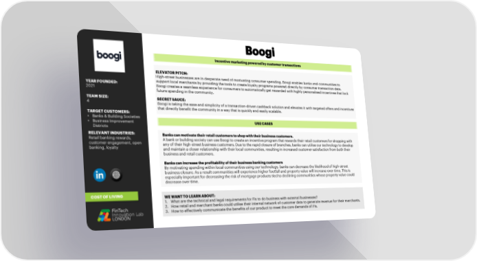 Incentive marketing powered by customer transactions ELEVATOR PITCH: High-street businesses are in desperate need of motivating consumer spending. Boogienables banks and communities to YEAR FOUNDED: support local merchants by providing the tools to create loyalty programs powered directly by consumer transaction data. 2021 Boogicreates a seamless experience for consumers to automatically get rewarded with highly personalised incentives that lock future spending in the community. TEAM SIZE: SECRET SAUCE: 4 Boogiis taking the ease and simplicity of a transaction-driven cashback solutionand elevates it with targeted offers and incentives that directly benefit the community in a way that is quickly and easily scalable. TARGET CUSTOMERS: • Banks & Building Societies • Business Improvement USE CASES Districts RELEVANT INDUSTRIES: Banks can motivate their retail customers to shop with their business customers. Retail banking rewards, A bank or building society can use Boogito create an incentive program that rewards their retail customers for shopping with customer engagement, open any of their high-street business customers. Due to the rapid closure of branches, banks can utilise our technology to develop banking, loyalty and maintain a closer relationship with their local communities, resulting in increased customer satisfaction from both their business and retail customers. Banks can increase the profitability of their business banking customers By motivating spending within local communities using our technology, banks can decrease the likelihood of high-street business closure. As a result communities will experience higher footfall and property value will increase over time. This is especially important for decreasing the risk of mortgage products tied to declining communities whose property value could decrease over time. COST OF LIVING WE WANT TO LEARN ABOUT: 1. What are the technical and legal requirements for FIs to do business with external businesses? 2. How retail and merchant banks could utilisetheir internal network of customer data to generate revenue for their merchants. 3. How to effectively communicate the benefits of our product to meet the core demands of FIs.