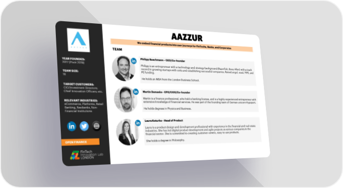 We embed financial products into user journeys for FinTechs, Banks, and Corporates TEAM YEAR FOUNDED: Philipp Buschmann–CEO/Co-founder 2017 (Pivot 2019) Philipp is an entrepreneur with a technology and strategy background (Razorfish, Booz Allen) with a track record in growing startups with exits and establishing successful companies. Raised angel, seed, PIPE, and TEAM SIZE: PE funding. 16 He holds an MBA from the London Business School. TARGET CUSTOMERS: CIO/Investment Directors; Chief Innovation Officers; etc. Martin Damaske-CFO/COO/Co-founder RELEVANT INDUSTRIES: Martin is a finance professional, who held a banking license, and is a highly experienced entrepreneur with eCommerce, Platforms, Retail extensive knowledge of financial services. He was part of the founding team ofGerman unicornHypoport. Banking, Neobanks, Non- He holds degrees in Physics and Business. Financial Institutions Laura Keturke–Head of Product Laura is a product design and development professional with experience in the financial and real estate industries. She has led digital product development and agile projects at various companies in the financial sector. She is committed to creating customer-centric, easy-to-use products. OPEN FINANCE She holds a degree in Philosophy.