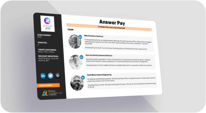 Answer Pay Creating a fairer way to pay and get paid TEAM YEAR FOUNDED: Mike Chambers: Chairman 2020 A recognised authority on retail payments, Mike was the Chief Executive Officer of Bacs (the UK’s biggest retail payment system) from 2004 until 2018. He also publishes the industry newsletter, “Payments TEAM SIZE: Unpacked” 6 Amazing thing I’ve built: Current Account Switching Service (CASS) and Cash ISA transfer service TARGET CUSTOMERS: Banks, PSPs, Utilities RELEVANT INDUSTRIES: Peter Cornforth: Commercial Director Retail Banking, Corporate Payments product specialist. 15 years of experience in the payment arena with Santander, Vodafone, Banking, B2C Amazon and Paysafe. Extensive experience in business development and product management. Amazing thing I’ve built: Vodafone M-Pesa, the global reference for a successful mobile money solution Ismail Bhana: Head of Engineering An experienced software engineer, architect and has a PhD in Computer Science. He has a track record of project successes in the FinTech sector. OPEN FINANCE Amazing thing I’ve built: The award winning Sky Go app, in the top 10 most downloaded entertainment apps in the UK