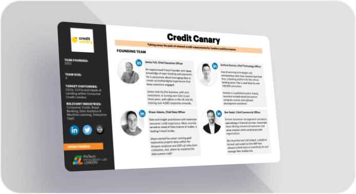 Taking away the pain of missed credit repayments for lenders and borrowers FOUNDING TEAM YEAR FOUNDED: James Fell, Chief Executive Officer Andrew Duncan, Chief Technology Officer 2022 An experienced fintech founder with deep Award-winning technologist and knowledge of open banking and payments. entrepreneur who most recently launched TEAM SIZE: He is passionate about leveraging data to Soar, a banking platform for the ethical 4 create unrivalled digital experiences that lending sector that is used daily by over keep customers engaged. 100,000 consumers. TARGET CUSTOMERS: CEOs, COOs and Heads of James took his first business, with zero Andrew is a published author, having Lending within Consumer investment, to turning over £2m in just launched multiple books focused on Credit Lenders three years, with offices in the UK and US, computer science and software RELEVANT INDUSTRIES: training over 4,000 corporates annually. development excellence. Consumer Credit, Retail Banking, Data Analytics & Shaun Adams, Chief Data Officer Ben Nadel, Chief Commercial Officer Machine Learning, Enterprise SaaS Data and insight practitioner with extensive Former Accenture management consultant, consumer credit experience. Most recently specialising in financial services. Passionate served as Head of Data Science at Auden, a about driving commercial outcomes and leading Fintech lender. value creation within enterprise-scale organisations. Shaun started his career running gold OPEN FINANCE exploration projects deep within the Ben launched and sold bnbpal, a platform Amazon rainforest and 100’s of miles from he built and scaled to £1m ARR that civilisation, and, where he mastered his allowed airbnb hosts to seamlessly list and data science craft! manage their holiday lets.