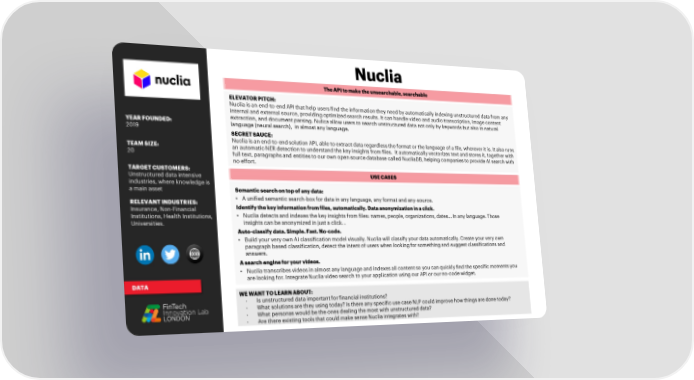 Nuclia The API to make the unsearchable, searchable ELEVATOR PITCH: Nucliais an end-to-end API that help users find the information they need by automatically indexing unstructured data from any internal and external source, providing optimized search results. It can handle video and audio transcription, image content YEAR FOUNDED: extraction, and document parsing. Nulicaallow users to search unstructured data not only by keywords but also in natural 2019 language (neural search), in almost any language. SECRET SAUCE: Nucliais an end-to-end solution API, able to extract data regardless the format or the language of a file, wherever it is. It also runs TEAM SIZE: an automatic NER detection to understand the key insights from files. It automatically vectorizes text and stores it, together with 20 full text, paragraphs and entities to our own open source database called NucliaDB, helping companies to provide AI search with no effort. TARGET CUSTOMERS: USE CASES Unstructured data intensive industries, where knowledge is a main asset Semantic search on top of any data: RELEVANT INDUSTRIES: • A unified semantic search-box for data in any language, any format and any-source. Insurance, Non-Financial Identify the key information from files, automatically. Data anonymization in a click. Institutions, Health Institutions, • Nucliadetects and indexes the key insights from files: names, people, organizations, dates… In any language. Those Universities. insights can be anonymized in just a click. . Auto-classify data. Simple. Fast. No-code. • Build your very own AI classification model visually. Nuclia will classify your data automatically. Create your very own paragraph based classification, detect the intent of users when looking for something and suggest classifications and answers. A search engine for your videos. • Nucliatranscribes videos in almost any language and indexes all content so you can quickly find the specific moments you are looking for. Integrate Nuclia video search to your application using our API or our no-code widget. DATA WE WANT TO LEARN ABOUT: - Is unstructured data important for financial institutions? - What solutions are they using today? Is there any specific use case NLP could improve how things are done today? - What personas would be the ones dealing the most with unstructured data? - Are there existing tools that could make sense Nucliaintegrates with?