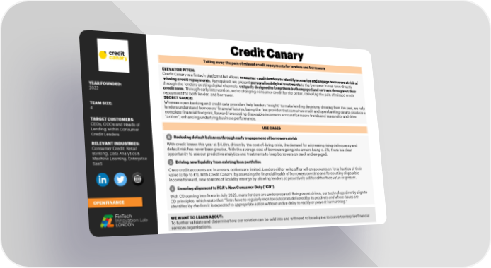 Taking away the pain of missed credit repayments for lenders and borrowers ELEVATOR PITCH: Credit Canary is a fintech platform that allows consumer credit lenders to identify scenarios and engage borrowers at risk of missing credit repayments. As required, we present personalised digital treatments to the borrower in real-time directly YEAR FOUNDED: through the lenders existing digital channels, uniquely designed to keep them both engaged and on track throughout their 2022 credit term. Through early intervention, we’re changing consumer credit for the better, removing the pain of missed credit repayment for both lender, and borrower. SECRET SAUCE: TEAM SIZE: Whereas open banking and credit data providers help lenders “insight” to make lending decisions, drawing from the past, we help 4 lenders understand borrowers’ financial futures, being the first provider that combines credit and open banking data to produce a complete financial footprint, forward forecasting disposable income to account for macro trends and seasonality and drive TARGET CUSTOMERS: “action”, enhancing underlying business performance. CEOs, COOs and Heads of USE CASES Lending within Consumer Credit Lenders 1 Reducing default balances through early engagement of borrowers at risk RELEVANT INDUSTRIES: With credit losses this year at $4.6tn, driven by the cost-of-living crisis, the demand for addressing rising delinquency and Consumer Credit, Retail default risk has never been greater. With the average cost of borrowers going into arrears being c. £1k, there is a clear Banking, Data Analytics & opportunity to use our predictive analytics and treatments to keep borrowers on track and engaged. Machine Learning, Enterprise Driving new liquidity from existing loan portfolios SaaS 2 Once credit accounts are in arrears, options are limited. Lenders either write off or sell on accounts on for a fraction of their value (c 9p to £1). With Credit Canary, by assessing the financial health of borrowers overtime and forecasting disposable income forward, new sources of liquidity emerge by allowing lenders to proactively sell for either face value or greater. 3 Ensuring alignment to FCA’s New Consumer Duty (“CD”) With CD coming into force in July 2023, many lenders are underprepared. Being event-driven, our technology directly align to OPEN FINANCE CD principles, which state that ”firms have to regularly monitor outcomes delivered by its products and where issues are identified by the firm it is expected to appropriate action without undue delay to rectify or prevent harm arising.” WE WANT TO LEARN ABOUT: To further validate and determine how our solution can be sold into and will need to be adapted to convert enterprise financial services organisations.