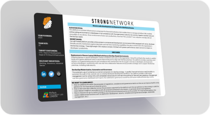 Secure code development workspaces for distributed teams ELEVATOR PITCH: Our platform is a private infrastructure component for financial institutions that enables them to manage and deliver fully installed, online coding environments to developers in full compliance with the organization’s security risk controls. Based on familiar tools and accessible on any device, these environments foster user productivity, have low TCO, provide IT cost reduction and align with all YEAR FOUNDED: DevSecOpsneeds. 2020 SECRET SAUCE: Our self-hosted platform provides online access to containerized development environments (CDEs) equipped with native, developer- TEAM SIZE: friendly security mechanisms against data leaks and real-time monitoring capabilities that play a central role in the organization’s 25 DevSecOpsstrategy. These lightweight CDEs replace complex VDI/DaaS with greater performance, lower cost and no impact on developers’ productivity. TARGET CUSTOMERS: USE CASES CTO, Head of Development, Head of IT/Cloud Infrastructure Replacement of Secure Laptop/VDI/DaaS with Secure DevOps-Ready Environments Shipping laptops to remote developers creates complexity and costs to the organization. Using VDI and DaaS often results in usability issues and require additional tools to secure data access and to align with DevOps practices. Our platform provides a seamless, joint RELEVANT INDUSTRIES: solution to (1) guaranteeing security and compliance with mechanisms that do not get in the way of developers, (2) ensure and Banking, Insurance, Industrial enhance developers’ productivity with new real-time collaboration features and (3) provide a strategic tool to support DevSecOps Sector practices, including code security. DevSecOpsModernization, Automation and Governance The systematic use of containers is a central component of a DevOps strategy. In parallel, financial institutions need the ability to automate the audit of risk controls over an entirely distributed development workforce. Our platform provides a self-hosted management tool for online CDEs with embedded remote security and real-time auditing for data and user operations. Managers get real-time governance dashboard and reports that yield better governance around key and custom-defined DevSecOpsmetrics. WE WANT TO LEARN ABOUT: CLOUD • How our platform fits within the ecosystem of regulations, compliance and governance metrics so that we can improve the ROI of the platform for the financial and industrial sectors. • How to fine-tune data collection across the processes supported by the platform such that we optimize our data strategy to yield the most relevant insights in accordance with all constraints attached to the industry, in particular privacy and regulations. • How to improve our go-to-market strategy in the financial and industrial sectors as the provider of a multi-faceted platform that covers needs across functions such as application development, security, compliance and governance (budget, stakeholder management. etc.)