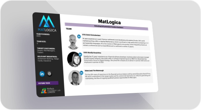 MatLogica Unlocking full potential of modern hardware TEAM YEAR FOUNDED: CTO: Dmitri Goloubentsev 2020 18 years experience in quant finance, mathematics and developing risk systems (Lloyds, CIBC world markets) and has a MSc in Applied Mathematics. Dmitri is proficient in high-performance computing in C++ TEAM SIZE: and assembler languages. He is the inventor of MatLogica'score product. Dmitri frequently presents at 5 industry conferences such as QuantMindsand co-authored a number of papers. TARGET CUSTOMERS: Quants, Risk Managers, COO: Natalija Karpichina Traders RELEVANT INDUSTRIES: Natalija has 15 years' experience as a financial software developer, business analyst and project manager Investment Banking, Hedge (Credit Suisse/Trafigura). She holds a MSc in Software Engineering and an MBA from Bayes Business Funds, Insurance School with a focus on Digital Strategy. She joined the company as an advisor in summer 2020 and as an employee in summer of 2021. Sales Lead: Tim Watmough Tim has 20+ years of experience in the financial services industry and has owned Executive Search firms. His warm connections in the target market and his commercial experience are critical to generating and maintaining the flow of ongoing qualified business opportunities for MatLogica. FUTURE TECH