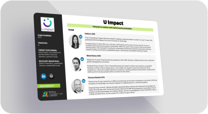 Using data to mobilise retail capital towards sustainability TEAM Lesley Li: CEO YEAR FOUNDED: Prior to founding U Impact she has worked for leading investment banks in London for over 10 years. She 2021 graduated with two Masters from the University of Cambridge. TEAM SIZE: Amazing thing I’ve built: After over a decade, I left banking and founded a fintech with the mission to 6 mobilise retail investments towards sustainability. Within two years I have turned an idea into an award- winning fintech. We received EU funding for outstanding contributions towards social impact. We have TARGET CUSTOMERS: closed a funding round with an established player in the German sustainable investment market. Retail banks, fund platforms, private banks, financial Alistair Hume: COO advisors, pension funds Alistair has 13 years' financial services experience with HSBC, Barclays, Goldman Sachs, also a chartered RELEVANT INDUSTRIES: global management accountant. Retail investment, sustainable finance, sustainable funds Amazing thing I’ve built: Prior to the achievements at U Impact I’ve been instrumental in successfully leading a number of bank-wide projects, most notably the regulatory reporting for Barclays’ Brexit programme. I also have valuable experience working at a banking software provider where I implemented client proof of concept projects which converted to new clients. Clemens Chaskel: CTO Clemens has 15 years experience in R&D and technology & innovation management, also holds a PhD from SUSTAINABILITY University of Cambridge, two master's degrees in Engineering and is a chartered engineer. Amazing thing I’ve built: Clemens has been passionate about creating new things and turning ideas into reality since he was a kid. He has built drones, bikes and SCUBA diving equipment, has worked on lots of projects combining hardware and software design, and he is knowledgeable in both CAD/CAM as well as coding and electronics. He has a patent for a sensor for gas turbines.