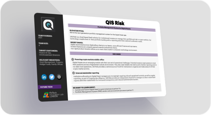 LOGO Portfolio Management System for Digital Assets ELEVATOR PITCH: We’re the next-generation portfolio management system for the Digital Asset age. YEAR FOUNDED: QIS Risk is a cloud-based SaaS solution for institutional investors to manage their portfolio and risk in crypto markets. Our 2021 technology couples best-in-class portfolio tracking with a reporting suite that’s tailored to allocator needs. SECRET SAUCE: TEAM SIZE: Highly automated activity feeds allow clients to run leaner, more efficient finance and ops teams. 4 Product features are uniquely geared towards institutional clients. Our rapid product iteration allows us to meet client needs in a dynamic technology environment. TARGET CUSTOMERS: Finance & Ops, USE CASES CIO/Investment Directors RELEVANT INDUSTRIES: 1 Powering crypto markets middle-office Asset Management, Treasury, Digital Assets are an emerging market with their own set of operational challenges. Potential investors need systems to track Hedge Funds, Family Offices their positions across a fragmented custody environment. They also need reliable risk metrics and a familiar reporting suite to run daily fund operations. QIS Risk provides a central source of truth for institutions to organize and make sense of all their crypto market activity. 2 External stakeholder reporting Institutions allocating to Digital Asset managers are increasingly requiring risk and operational controls, as well as regular reporting, as part of ongoing due diligence. QIS Risk provides an independent channel for managers to share customized reports with their stakeholder for increased transparency and reduced administrative burden. FUTURE TECH WE WANT TO LEARN ABOUT: • Current and future Digital Asset (crypto) initiatives at partner FIs • Portfolio Management System (PMS) vendor and procurement process at partner FI