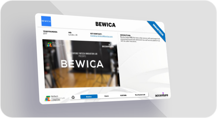 BEWICA YEAR FOUNDED: HQ: KEY CONTACT: DESCRIPTION: 2017 London, UK eva.berg-winters@bewica.com Bewica helps SMEs be more cyber secure with automated risk assessments and tools delivered via a self-service platform as well as cyber insurance. CEREBRON Bewica Caura PORTABL The Pension Lab
