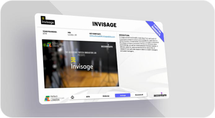 INVISAGE YEAR FOUNDED: HQ: KEY CONTACT: DESCRIPTION: 2016 London, UK vishnu.thurpati@invisagealpha.com Invisage extracts actionable trade ideas from vast pools of investment research content and intelligently maps them to global themes. It helps banks and asset managers understand the impact of macro-economic themes on individual ideas and holdings, as well as create bespoke thematic baskets. It delivers value for users across the entire value chain of research from sell-side research desks to wealth managers and asset managers. BITA CEREBRON Globacap Invisage ResonanceX