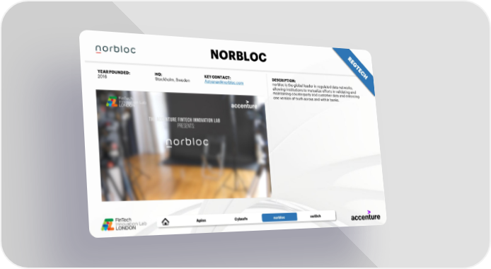 NORBLOC YEAR FOUNDED: HQ: KEY CONTACT: DESCRIPTION: 2016 Stockholm, Sweden [email protected] norbloc is the global leader in regulated data networks, allowing institutions to mutualize efforts in validating and maintaining counterparty and customer data and enforcing one version of truth across and within banks. CEREBRON Apiax Cybsafe norbloc swIDch
