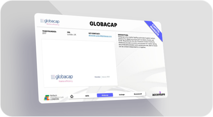 GLOBACAP YEAR FOUNDED: HQ: KEY CONTACT: DESCRIPTION: 2017 London, UK alexander.green@globacap.com Globacap is the market-leading automated capital markets platform for digital securities such as shares, bonds, and funds. Regulated by the UK’s Financial Conduct Authority, Globacap provides an end-to-end solution for capital raising, securities administration and custody services, each of which can be utilized independently or together. BITA CEREBRON Globacap Invisage ResonanceX