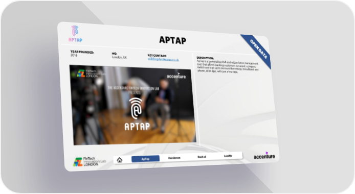 APTAP YEAR FOUNDED: HQ: KEY CONTACT: DESCRIPTION: 2018 London, UK [email protected] ApTap is a personalised bill and subscription management tool, that allows banking customers to cancel, compare, switch and sign up to services like energy, broadband and phone, all in-app, with just a few taps. CEREBRON ApTap Cerebreon Ducit.ai Lendflo