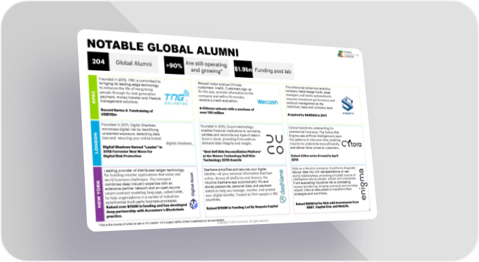 NOTABLE GLOBAL ALUMNI 204 Global Alumni >90% Are still operating $1.9bn Funding post lab and growing* Founded in 2013, TNG is committed to Wecashhelps analyzeChinese This enterprise behavioral analytics bringing its leading-edge technology customers9 credit. Customers sign up company helps hedge funds, asset to enhance the life of Hong Kong for the app, provide information to the managers and banks systematically CA people through its next generation company and within 15 minutes, improve investment performance and P payment, money transfer and lifestyle receive a credit evaluation. conduct management at the A management solutions. individual, team and company level. A Chinese unicorn with a userbase of Record Series A Fundraising of over 130 million Acquired by NASDAQ in 2017 US$115m Founded in 2011, Digital Shadows Founded in 2010, Duco9s technology Cytoratransforms underwriting for minimises digital risk by identifying enables financial institutions to normalise, commercial insurance. The Cytora Risk unwanted exposure, detecting data validate and reconcile any type of data in Engine uses artificial intelligence to learn DONloss and securing your online brand. Duco9s cloud, providing firms with on- the patterns of risks over time, enabling N demand data integrity and insight. insurers to underwrite more efficiently O Digital Shadows Named "Leader" in and deliver fairer prices to customers. L 2018 Forrester New Wave for