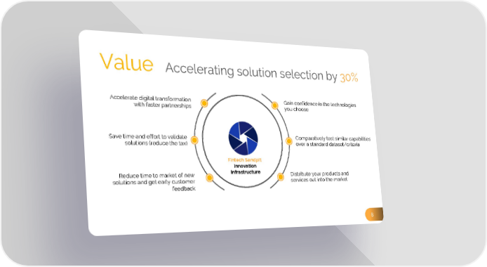 Value Accelerating solution selection by 30% Accelerate digital transformation Gain confidence in the technologies with faster partnerships you choose Save time and effort to validate Comparatively test similar capabilities solutions (reduce the tax) over a standard dataset/criteria Fintech Sandpit Innovation Reduce time to market of new Infrastructure Distribute your products and solutions and get early customer services out into the market feedback 8