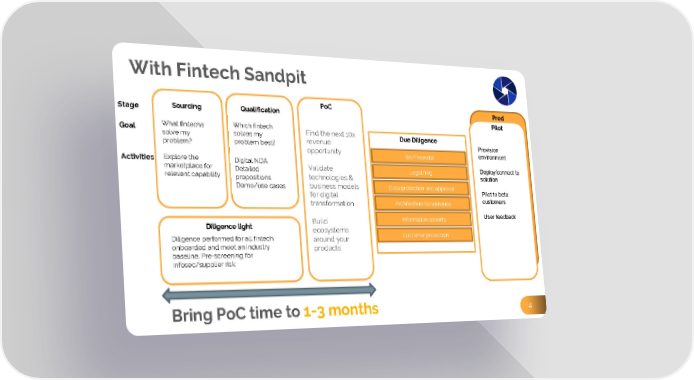 With Fintech Sandpit Sourcing PoC Prod Stage Qualification Pilot Goal What fintechs Which fintech Find the next 10x solve my solves my revenue Due Diligence problem? problem best? Provision opportunity Does this Biz/Financial environment Activities Explore the Digital NDA solution work for me? marketplace for Detailed Validate Legal/reg Deploy/connect to relevant capability propositions technologies & solution Demo/use cases business models Data protection and approval Pilot to beta for digital customers transformation Architecture Governance Build Information security User feedback Diligence light ecosystems Diligence performed for all fintech around your Customer protection onboarded and meet an industry products baseline. Pre-screening for 2 weeks infosec/supplier risk 3 months Bring PoCtime to 1-3 months 4