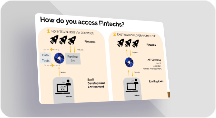 How do you access Fintechs? 1 NO INTEGRATION VIA BROWSER 2EXISTING DEVELOPER WORKFLOW Fintechs Fintechs Requests Requests Data Runtime Tests Env API Gateway Audit Analytics Access management Deploys Requests SaaS User Development User Existing tools Cloud Environment IDE Network Network 7