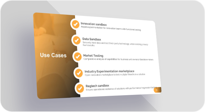 Innovation sandbox Rapid experimentation for innovation teams with functional testing Data Sandbox Securely host data and test third-party technology under existing privacy frameworks Use Cases Market Testing Comparative analysis of capabilities for business unit owners/decision makers Industry Experimentation marketplace Open innovation marketplace to test multiple fintechs in a solution Regtechsandbox Ensure operational resilience of solutions with performance/regression testing 9