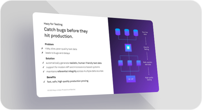 Hazy for Testing Your live Catch bugs before they data hit production. Problem Hazy for ✗ risky, slow, poor quality test data Testing ✗ leads to bugs and delays Solution ✓ automatically generate realistic, human-friendly test data Safe, realistic test data ✓ support for modern API and microservice based systems ✓ maintains referential integrity across multiple data sources Benefits ✓ fast, safe, high quality production proving QA / UAT High quality testing © 2020 Hazy Limited. Private & confidential.