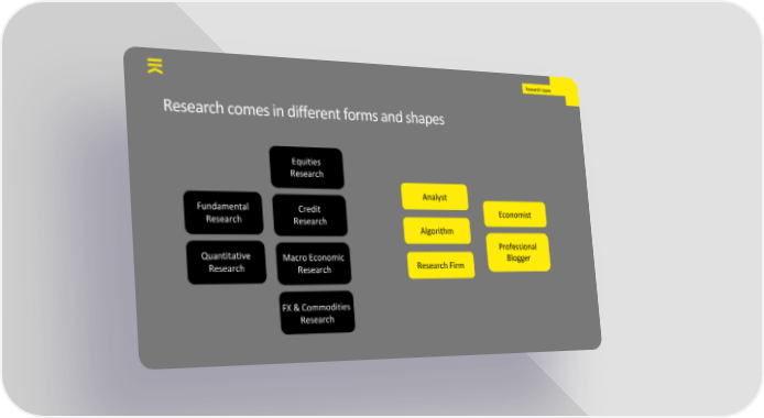 Research types Research comes in different forms and shapes Equities Research Analyst Fundamental Credit Economist Research Research Algorithm Quantitative Professional Research Macro Economic Research Firm Blogger Research FX & Commodities Research