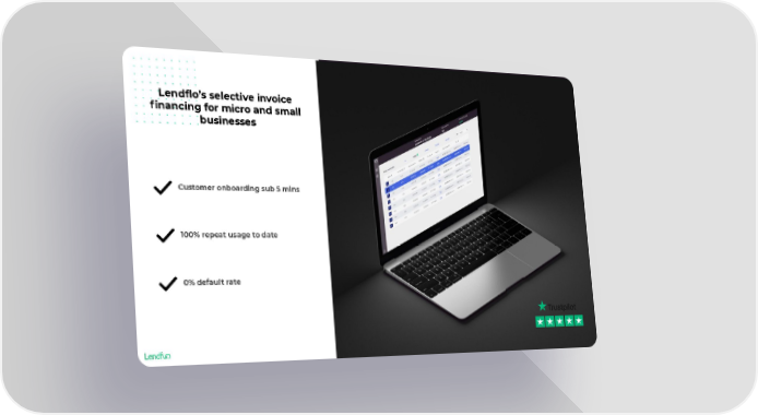 Lendflo’s selective invoice financing for micro and small businesses Customer onboarding sub 5 mins 100% repeat usage to date 0% default rate 6