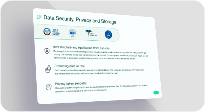 10 Data Security, Privacy and Storage Infrastructure and Application layer security Our encryption is maintained at the highest level including compliance with modern security standards (SOC2, HIPAA, ISO 27001). This provides secure data transmission over the Internet. Our deployments on AWS, GCP and Azure means you get all the bene fi ts of world class compliance programs on physical data center, network and storage security. Protecting data at rest Each customer account is assigned a separate encrypted database. This encryption provides you with the assurance that if these disks are isolated and re-mounted elsewhere they cannot be read. Privacy taken seriously Mammoth is GDPR compliant and cares deeply about protecting customer data. The Mammoth application has a robust permission model designed at its core to support data security.