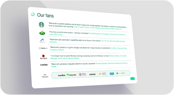 3 Our fans “Mammoth’s powerful platform and the team’s deep level of data expertise has helped us achieve an unprecedented level of automation and reporting” Patrik Lundell, Director Channel Business Development EMEA, Starbucks “Mammoth’s solution is a game changer and allows for a huge increase in productivity” Ken Blau, Financial & Data Analytics, Rethink “Mammoth data automation capabilities allow us to focus on the science” Tien Yin Yau, Senior Scientist, Everest Detection “I no longer have to spend Sunday evenings preparing reports for Monday morning” Kathleen Blythe, Innovations Manager UK & Ireland, Bacardi Martini “Mammoth painlessly integrates data from anyone, anywhere” Russell Sylvester, Business Development Director, Kantar Our Partners ”It is truly an end-to-end solution - seriously impressive” David Blackshaw, Intl Category & Commercial Excellence Lead, Arla Foods